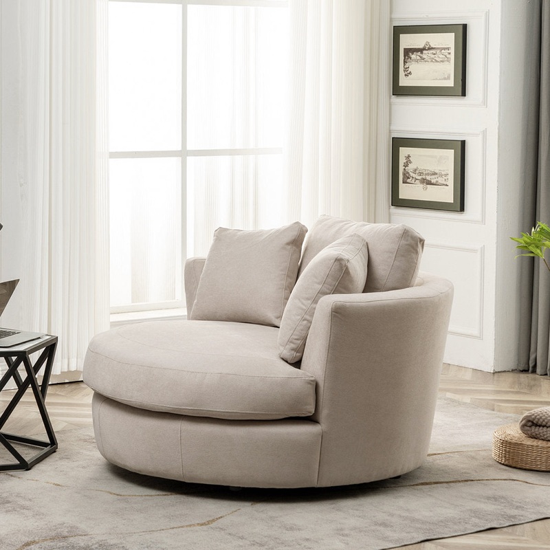 This oversized swivel barrel chair-and-a-half is all about cool comfort and modern style. With a seat cushion and a curved back, it offers a contemporary look and large-scale appeal. The chair is crafted with a metal frame, recessed arms, and a round pedes