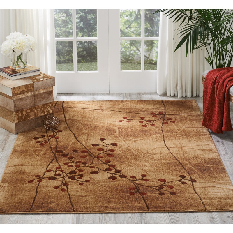 This indoor area rug showcases a sprig of leaves for a natural look that grounds your space in traditional style. It's power-loomed from polyester and acrylic, and it showcases a blend of taupe, beige, and red hues for a warm foundation wherever you roll i