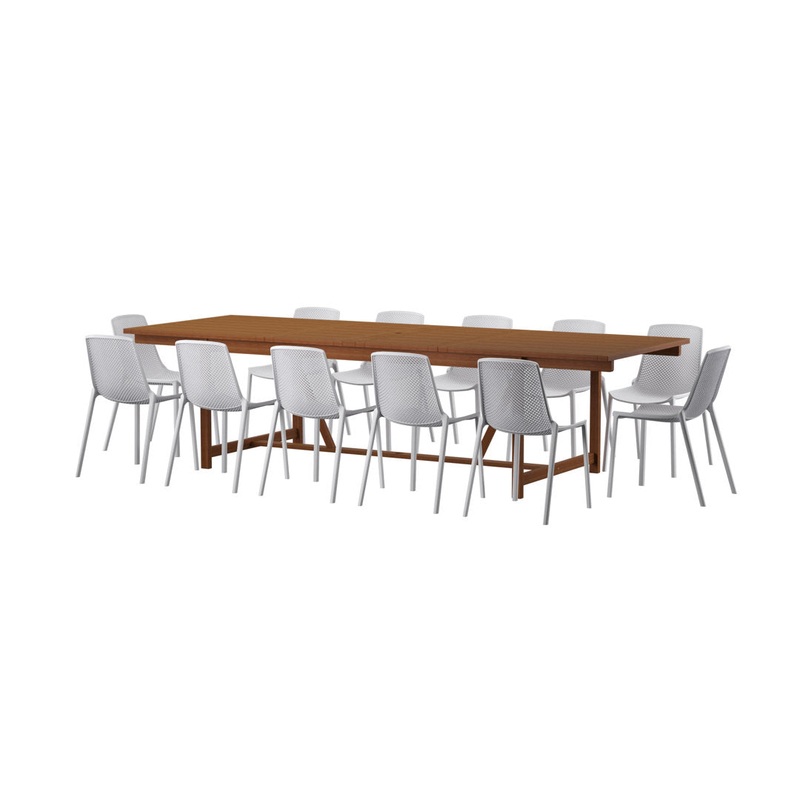 Fit the whole family for backyard BBQs and fun dinner parties with this rectangular 12 - person 118" long dining set. Crafted from solid eucalyptus wood, the rectangular table that anchors the set sports a neutral finish for a warm and natural look. An umb