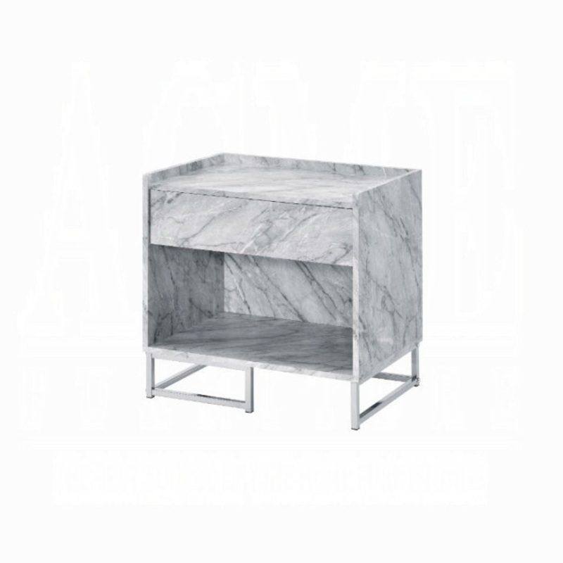 With bold, extravagant textures, the Azrael Accent Table beautifully complements a modern home. White printed faux marble highlights the clean, straight lines of the accent table, showcasing a luxurious appeal and simplistic elegance. Metal sled base with shiny chrome finish enhances it’s intriguing look and feel. It offers a drawer and open compartment that provide necessary bedroom storage.