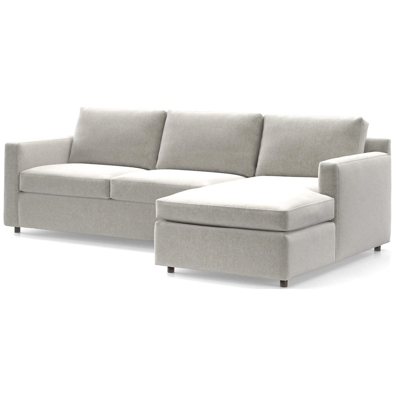 Barrett makes modern sectional seating affordable and carefree. Upright yet comfortable, this versatile sectional looks casual and clean in a contemporary fabric that feels great to the touch and is so durable you don’t need to worry about spills or pets. The two-piece sectional is designed to always look its best, even in high-traffic family rooms. The Barrett II 2-Piece Left-Arm Chaise Sectional is a Crate & Barrel exclusive.Barrett II 2-Piece Sectional Sofa with Chaise Lounge30″Hheight101.5″Wwidth61.5″DdepthMeasurements are in inches.Frames are benchmade with certified sustainable engineered hardwood that’s kiln-dried to prevent warpingDurable, independently tested, 7.5-gauge sinuous spring foundation designed to support cushions and eliminate saggingHigh-resilience polyfoam seat cushions wrapped in soy-based foam and encased in synthetic tickingFiber back cushions encased in synthetic tickingTopstitch detailingLeft-Arm Chaise, Right-Arm Apartment SofaMade in USA of Domestic and Imported Materials