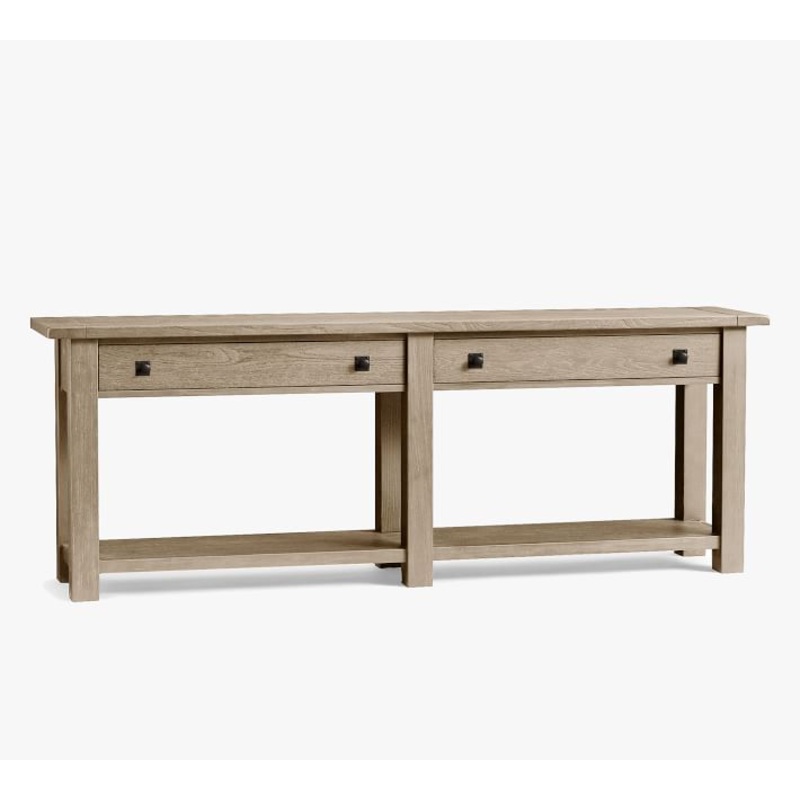 Inspired by an early 20th-century worktable that belonged to our designers great-grandfather, the Benchwright Collection honors the strength and simplicity of rustic-industrial design. For a savvy storage solution, this console table features two large drawers built with English dovetail joinery and smooth-gliding hardware. A hand-applied finish highlights each intentional saw mark and groove across the woods naturally occurring grain.Finished by hand using our exclusive multi-step process that creates exceptional depth of color; available in Seadrift, Rustic Mahogany, Gray Wash or Blackened Oak finish.Kiln-dried wood helps prevent warping, splitting, cracking and developing mildew.Features 5 ply construction.MDF is an engineered wood that lends exceptional strength and ensures the products structural integrity over time.The use of veneers results in high-quality furniture that has flawless surfaces and consistent color tones that will not be subject to cracking.Adjustable levelers help with stability on uneven surfaces.Imported.