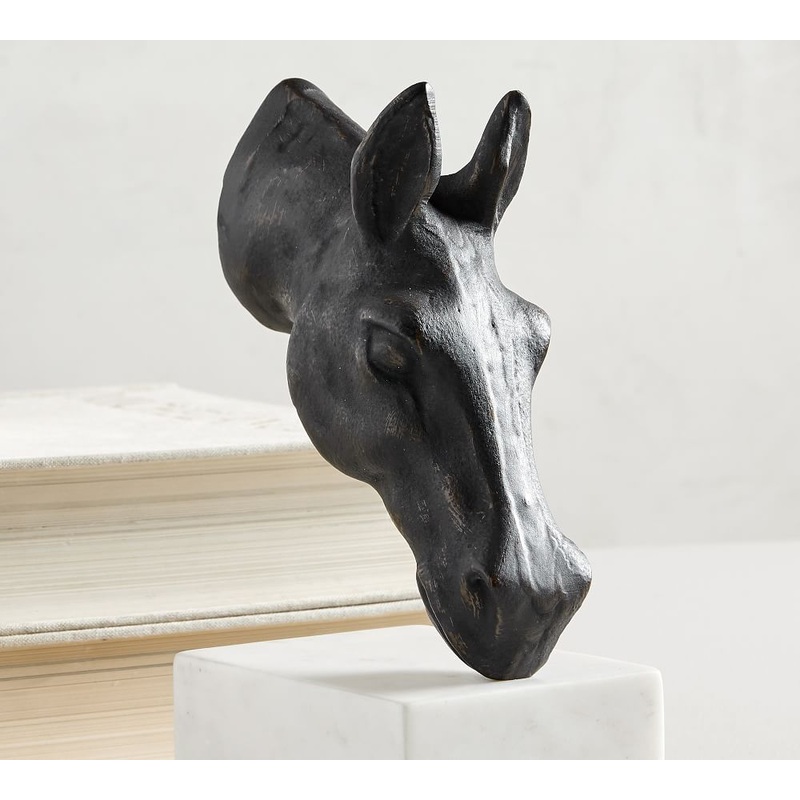 Bring a touch of the English countryside to your reading room with these sculptural horse head bookends, which are cast of bronze and set upon white marble. Decorative and functional, they securely hold favorite tomes while exuding equestrian style.