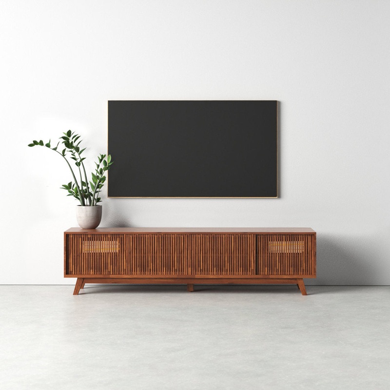 This TV stand features clean lines, a low profile, and flared legs that draw inspiration from mid-century design. It's crafted from solid and engineered wood with a dynamic finish that works with various styles and color schemes. We love the vertically sla