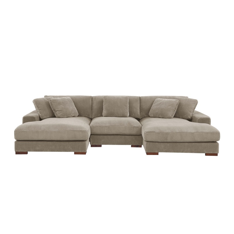 This modern 125" U-shaped corner sectional brings style and comfort to your living room. The modular design allows you to arrange the sofa to best suit your space. It's crafted with an engineered wood frame and sits on solid wood legs with a warm brown fin