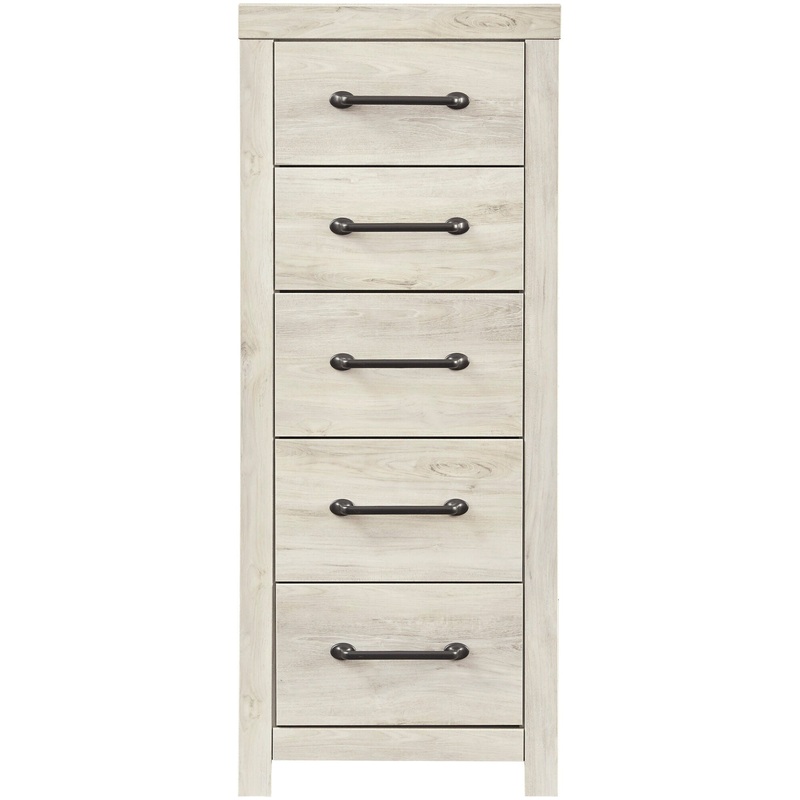The Cambeck chest is all sleek, modern lines with a hint of farmhouse influence in the faux whitewash finish. This slim silhouette is perfect as a lingerie chest or for other delicate clothes and accessories. Dark, oversized drawer pulls add the element of