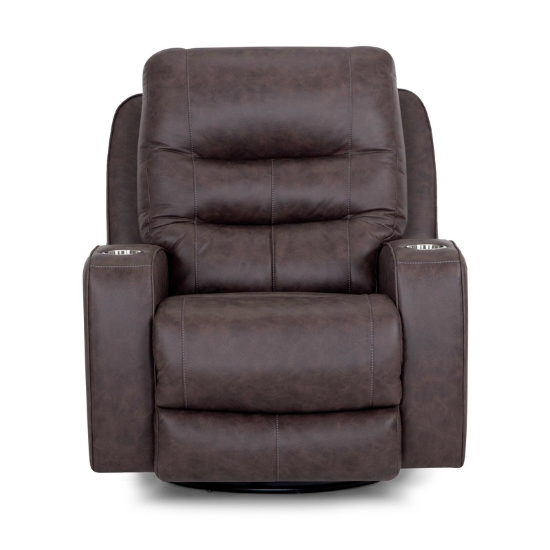 Modern style, amazing comfort! This power swivel rocking recliner comes with a power headrest, dual stainless steel cupholders, and a USB port. The sloped, ergonomic track arm combines a modern look with plush comfort. Built with 100% plywood, an 8-Gage st