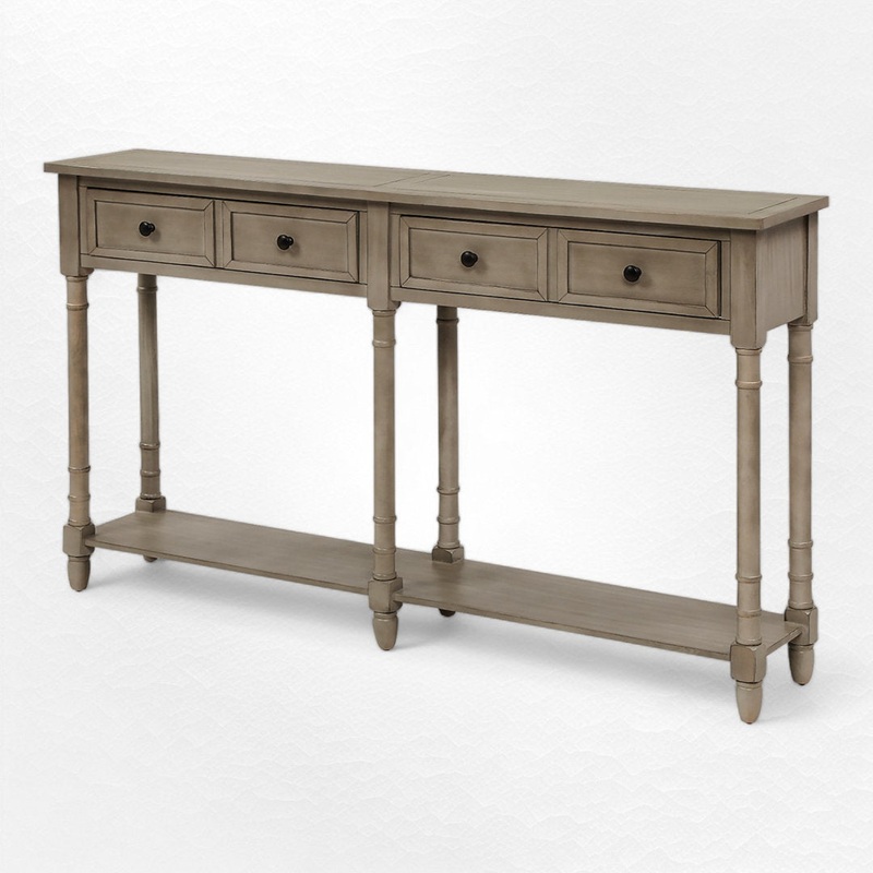 Infuse your home with the timeless charm of this rustic console table, a piece that blends classic design with a touch of vintage allure. Crafted with a sturdy pine wood frame and complemented by MDF panels, it is finished in a distressed style that adds character and warmth to any space. This table boasts two smoothly gliding drawers, offering ample storage for keeping essentials organized and out of sight. The lower shelf provides additional display space, perfect for books, vases, or baskets. With its tapered legs and robust construction, this console table not only serves as a functional asset but also as a statement piece that enhances the rustic aesthetics of your dcor. Charlton Home Color: Gray Wash