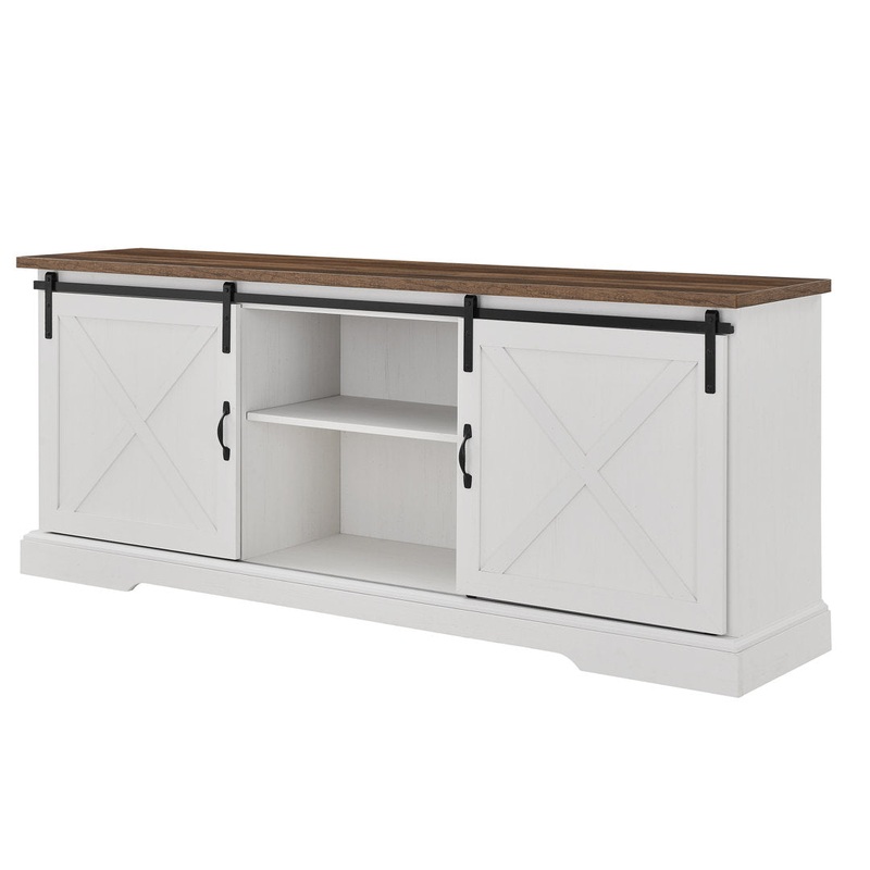This TV stand combines coastal and farmhouse styles with convenient storage. Crafted from engineered wood and meta. A rectangular silhouette shows off shelves that are just right for displaying a few decorative favorites, with two sliding barn-style doors