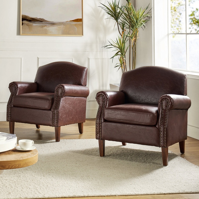 This 2-piece armchair set delivers classic style and an instantly curated look. Each chair is made with a solid and engineered wood frame and sits on tapered legs with a walnut finish. They're wrapped in neutral-hued faux leather upholstery, and their foam