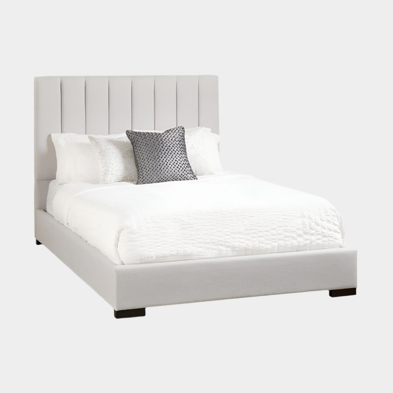 This upholstered bed in grey linen exudes understated elegance, combining soft texture with sleek design.The headboard features vertical channeling, adding depth and a refined visual appeal.Its soothing grey tone makes it a versatile fit for both modern an