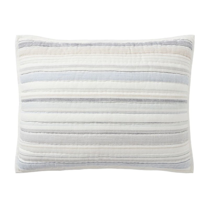 Horizontal stripes make a bed feel more expansive while also imparting a casual, breezy style that's warm and welcoming. The yarn-dyed hues and quilt-like stitching adds textural variations for a relaxed look and feel.Hand quilted of 100% cotton.Filled wit