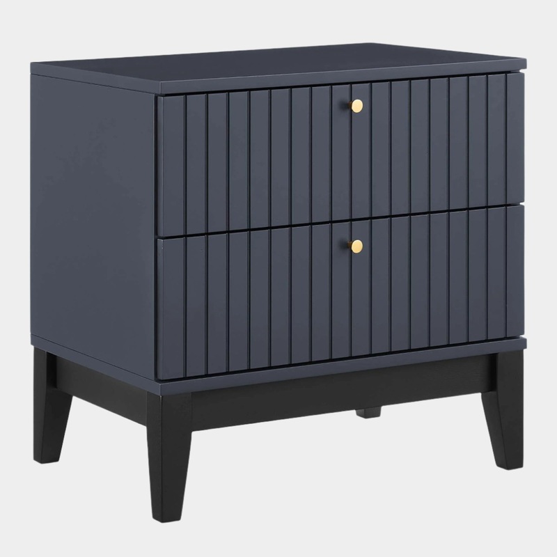 Restyle your bedroom decor with the Dakota Nightstand. Blending contemporary modern design with mid-century style, this nightstands is complete with a clean-lined design with panel detail and brass hardware. Also functional as a versatile end table or accent table, this nightstand features a durable rubberwood and painted MDF construction and rests atop a tapered frame with felt foot pads to protect flooring. Keep visual space clean with the ample storage space in the two full-extension drawers perfect for storing bedside essentials.