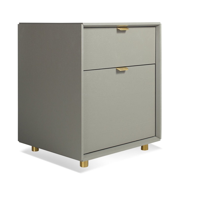 The perforated wood door front allows the use of remotes without spoiling the view. Brass details and wood base. Blu Dot Color: Risk-Averse Gray