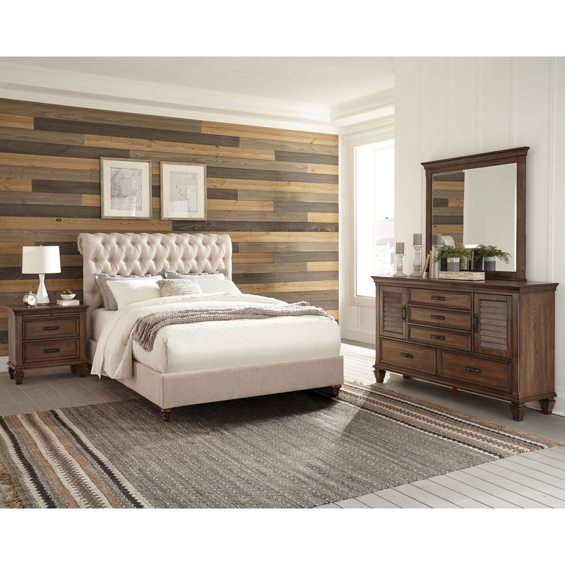 With a look of graceful elegance, this four-piece bedroom set is simply exquisite. It features a bed, nightstand, dresser, and mirror to beautifully complete your space. Spacious drawers provide plenty of convenient storage. A button tufted headboard lends