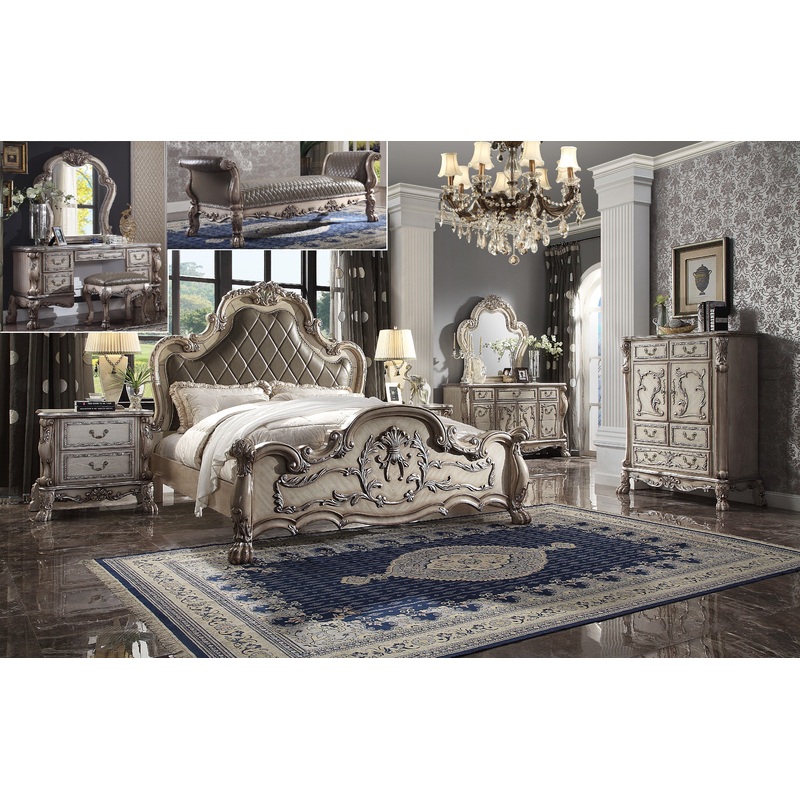 ACME Dresden Queen Bed, Vintage Bone White & PU, 92″ x 72″ x 72″H, 226lbs. Elegant yet lightheartedly playful, Dresden is donned in an amiable Vintage Bone White finish with hand-applied burnish over the many layers of stains and finishes that are manually rubbed on, providing depth and character to this group. The Rococo style it is candidly represented in the classic ornamental features of Dresden, with the carefully chosen inlay, plentiful decorative scrolled moldings, and ample sizes worthy of a Master Bedroom Collection. Features: – Exclusive Design – Box Spring Required – Panel Bed: Arched HB/FB (Low Profile FB) – Padded HB/FB: PU (Diamond Grid Pattern with Nail-Head Trim), Oversized Scrolled Crown, Trim & Claw Style Leg with Vintage Hand-Brushed Finish – Wooden Frame & Poly-Resin Motifs – Casegood Drawer: GLIDE) Center Metal (Undermount), DOVETAIL) French Front & Back, Felt-Lined Included – Arched Mirror Beveled – Collection Dresden available in 2 colors: Cherry Oak & Vintage Bone White Materials: Wood, Poly-Resin, Upholstered (HB)