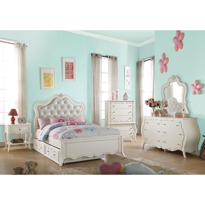ACME Edalene Full Bed, Pearl White (1Set/3Ctn), 87" x 60" x 56"H, 97lbs. Create the dream bedroom for your little girl with Edalene collection. Beautiful accents are seen throughout including clear rosette knobs and tapered legs. The bed features a pearl w