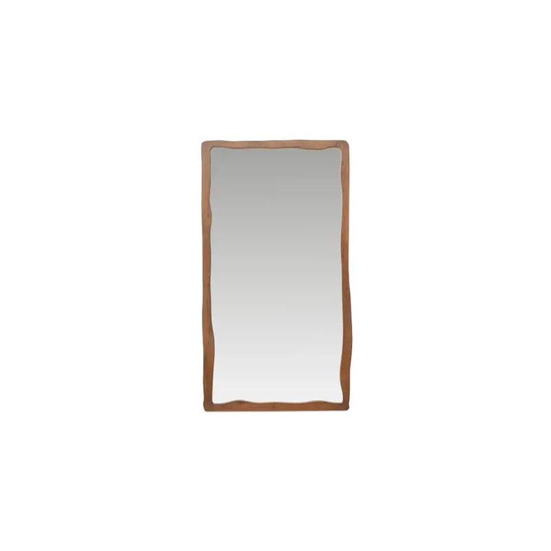 The Ellis mirror artfully fuses mid-century sensibility with contemporary flair. Encased by a robust solid Acacia wood frame, it features an alluring free-form wave design, finished in a mid-tone walnut brown that enriches its allure with a timeless warmth