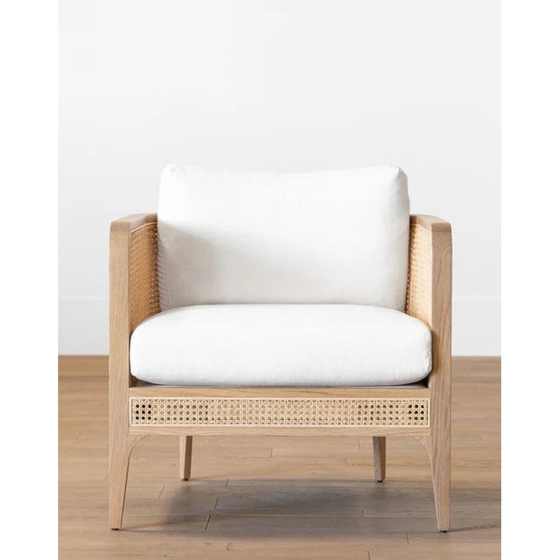 Expanded from our best-selling outdoor chair, the Elowyn Indoor Chair is crafted from a continuously curved frame of solid oak. Detailed with natural caning and complete with comfortable cushions in a soft linen and cotton blend, this piece brings an organ