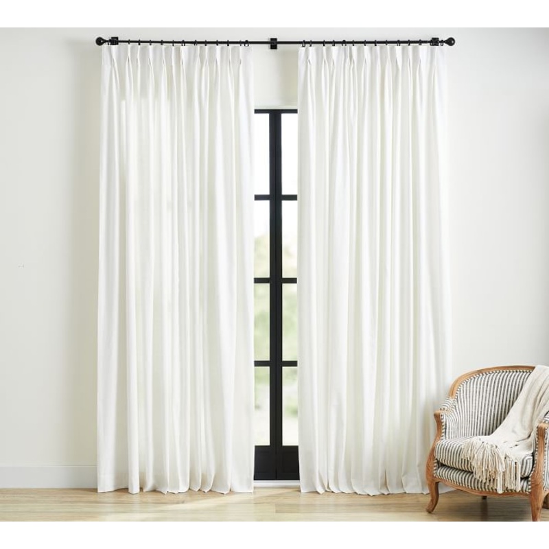 As part of our best-selling curtain collection, there are so many reasons to love the Emery Linen/Cotton Pinched Pleat Curtain. With a soft, luxurious drape, it brings both casual warmth and refined style to the room. The weave of the natural yarn-dyed fibers creates dimensional highs and lows for added depth.Made of a 73% linen and 27% cotton blend.Fair Trade Certified. The purchase of this product helps ensure fair and safe labor practices, improve livelihoods, and empower workers to invest in their communities.STANDARD 100 by OEKO-TEX Certified: tested for 350+ harmful substances to keep you and your family safe from chemicals common to textile manufacturing.We’re a proud member of the Better Cotton Initiative (BCI). The Better Cotton Initiative trains farmers to care for the environment and respect workers rights and wellbeing. BCI cotton is not physically traceable to final products.Each panel is lined with Cotton lining for light filtration.Detailed with blind-stitched hems and pinched pleat at the top of the curtain.A single pinch pleat panel has 12 pleats at the top of the curtain.There are 14 hanging slots on the backside for pin hooks, each pin hook can be hung on a curtain ring (rings sold separately).15 hooks are included.Dry-clean only.Sold as individual panels.Watch a video on how to hang a curtain.Imported.