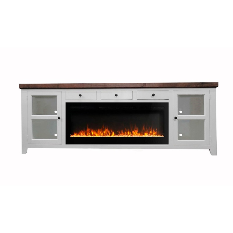 Transform your living room into a stylish and cozy haven with our exquisite Emily Painted 94″ TV Console, now available with a fireplace option. This stunning piece of furniture combines the elegance of classic design with the modern convenience of integrated heating, creating the perfect centerpiece for any home. Crafted with meticulous attention to detail, the console boasts a timeless painted finish that complements any dcor. Its clean lines and sophisticated look make it an ideal addition to both contemporary and traditional interiors. With its generous 94-inch length, this TV console provides ample space for all your entertainment essentials. It features a fixed shelf behind the doors and storage drawers to allow organized storage for media devices, DVDs, books, and decorative items. The optional fireplace will enhance the warmth and ambiance of your living room with the optional fireplace feature. The electric fireplace insert offers adjustable flame settings and heat output, allowing you to create a cozy atmosphere with the touch of a button. Whether you want to add a subtle glow or heat up the room, the fireplace option delivers comfort and style. – Product Details provided by Manufacturer, not responsible for errors in information.