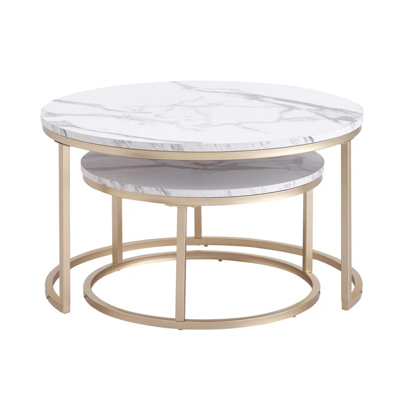 This 2-piece set of nesting tables features a gleaming gold base and marble-inspired tops for chic and sophisticated style in your living room. Each table is built on an open, circular steel metal with a sleek gold tint, and they can easily be pulled apart