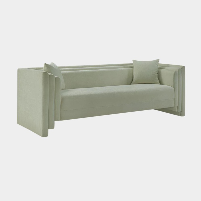 Make this Everett mint chenille fabric sofa the center of a cozy reading nook. Handsome from every angle, this posh sofa is plumply appointed to put supreme comfort within easy reach. Soft mint chenille upholstery fabric adds to its lavish feel while a staggered design gives it a modern edge. An included pillow gives it a beckoning vibe while the sofa’s solid wood inner frame makes it a lasting addition in any room.