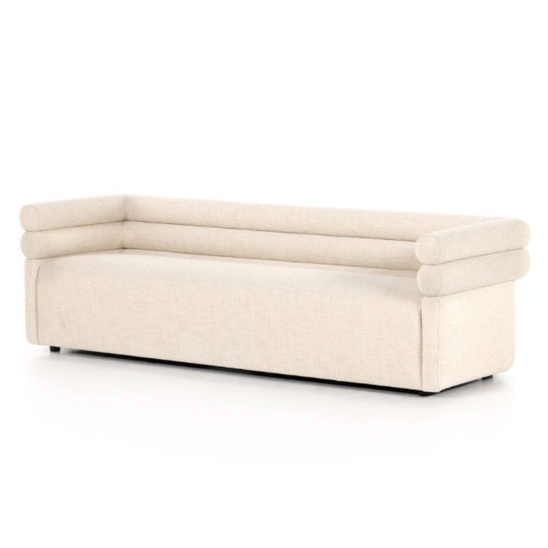 Horizontal channeling lends a clean, linear look to sofa-style seating, while cream-colored high-performance fabric adds fresh sensibility perfectly suited for the modern living room.Overall Dimensions: 88.50"w x 30.00"d x 26.75"hColors: Hampton CreamMater
