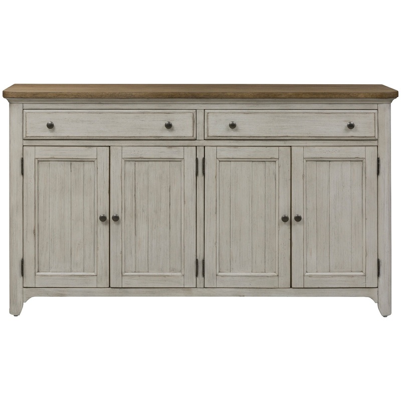 Enhance your dining space with a classic look and casual feel with the Farmhouse Reimagined server. Crafted of pine and poplar solids with hickory and pine veneers, this piece features a timeless antique white finish with a chestnut top and heavy wire brus