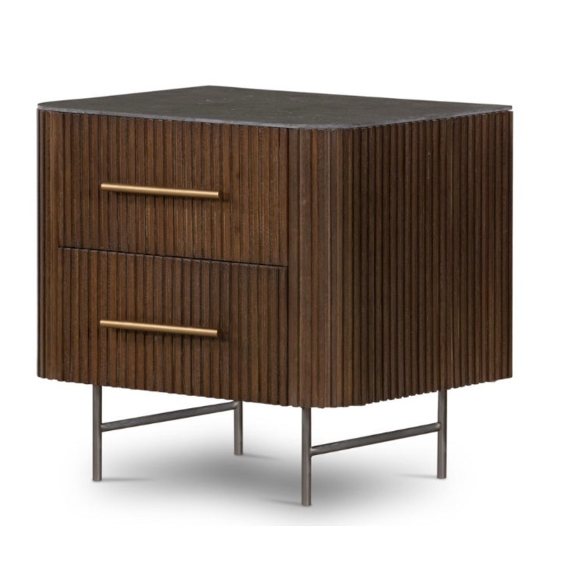 Rich with reeding for great texture and a linear look, brown-finished solid oak flaunts dual drawers with polished brass hardware and coolly curved corners, while a bluestone top brings a beautifully complementary material mix to bedroom storage.