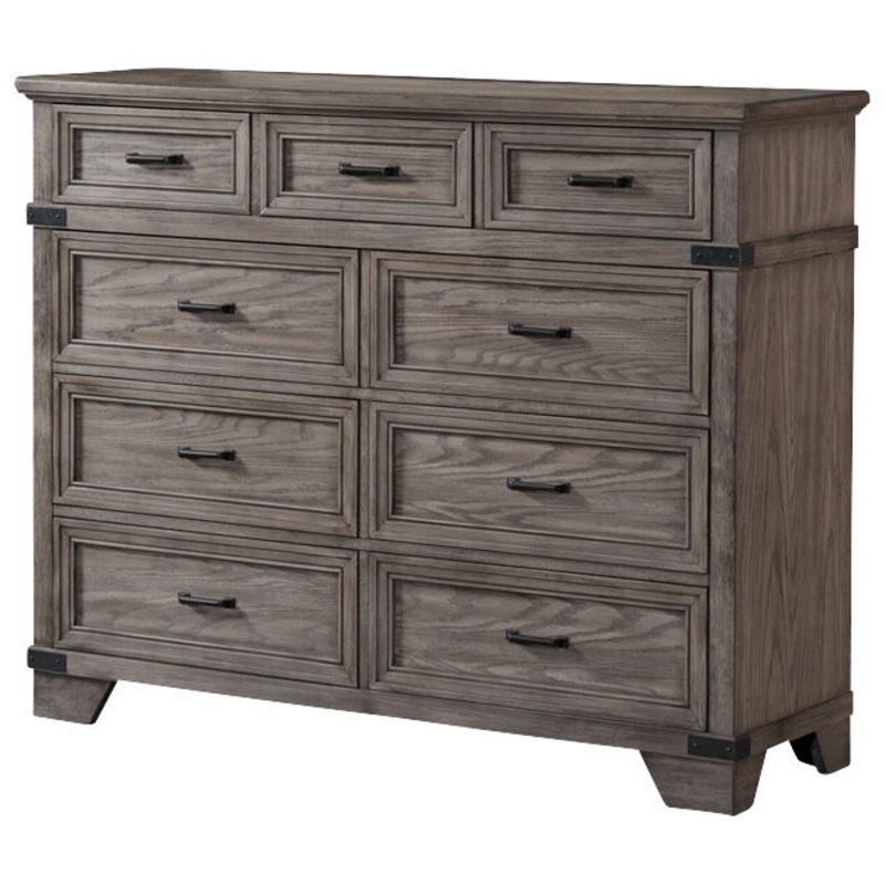 If strong and traditional is your style, then the Forge dresser was made for you. Made of wire-rubbed oak veneer and hardwood solids with a brushed steel finish, this 9-drawer dresser makes a statement in your bedroom. Six paired bottom drawers are large and deep, while 3 smaller drawers fill the top row. All drawers have English and French dovetail construction and full extension glides. Each drawer has a metal pull handle, and matching metal brackets are attached to the corners to accent the strong style. Add an optional attachable mirror if you like, or leave this dresser on its own and add a matching floor mirror instead. The Forge collection gives you plenty of options.