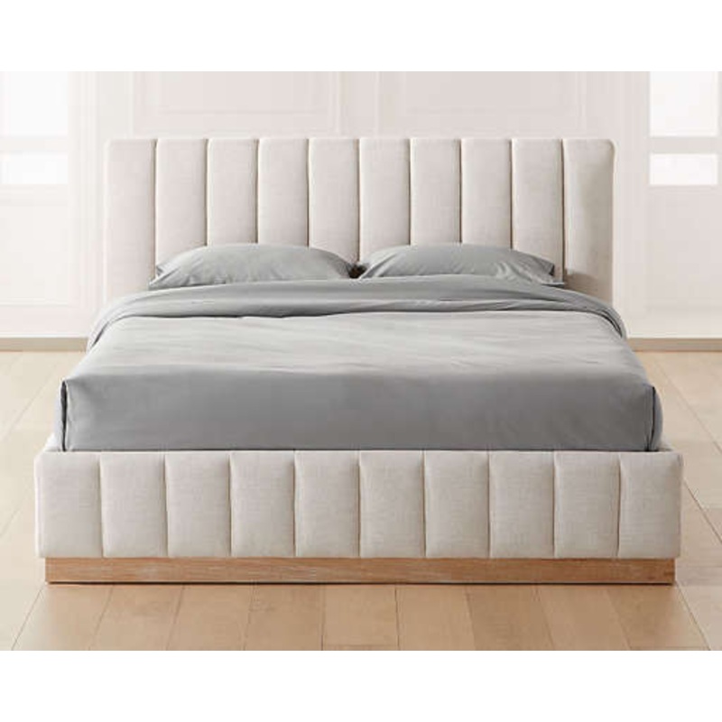 Designed by Mermelada Estudio, cushy channels of lush white upholstery line the length of this finely tailored bed. Plinth oak wood base keeps a minimal profile finished in a subtle whitewash. A true statement piece. Performance poly/linen upholstery stand