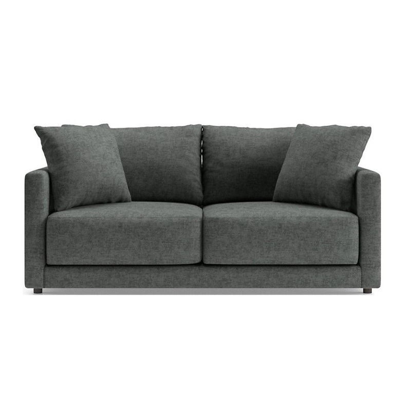 Everyone’s invited to Gather.Clean-lined and current, our Gather petite apartment sofa strikes the perfect balance between comfort and modern style. Scaled for smaller living spaces, the apartment-sized sofa breaks new ground with a thin deck that puts all the focus on its boxy, extra-plush seat cushions that sit comfy but not too deep.Trim top-stitching and seamless armrests keep the look neat, not fussy. An exclusive Crate and Barrel design, the Gather petite apartment sofa is made with engineered wood certified by the Forest Stewardship Council (FSC ), the environmental gold standard for responsibly managed forests.Gather Apartment Sofa 77″Wx38″Dx26″HFrame is benchmade with FSC -certified engineered hardwood that’s kiln-dried to prevent warpingSeat cushions are innerspring wrapped in polyfoam with fiber encased in tickingBack cushions are full-blown fiber encased in tickingIncludes 2 knife-edge throw pillowsTop-stitch detailSee product label or call customer service for additional details on product content