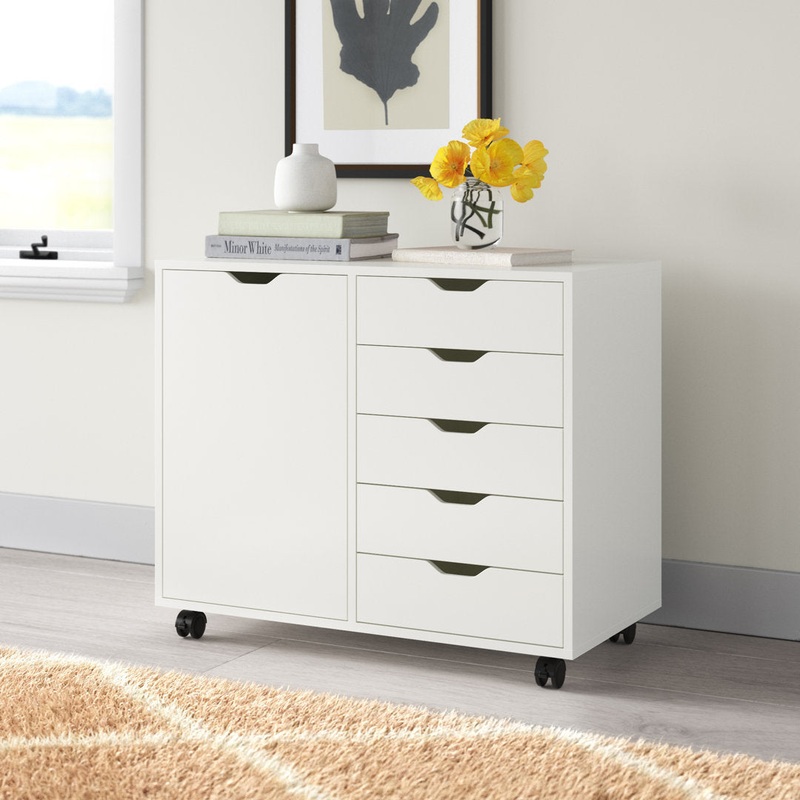 With a wide top, an enclosed cabinet, and five spacious drawers, this mobile file cabinet is designed to help you organize your printers, books, files, stationery, and more. The adjustable shelf ensures that you can accommodate items of different sizes. Th