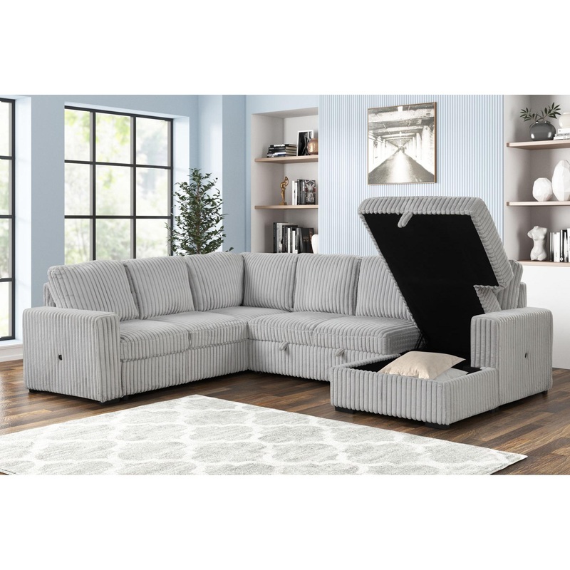 Sleek and functional, the Divine Sectional features modern track arms, channeled upholstery for added comfort, and hidden storage in the chaiseperfect for stylish, organized living.