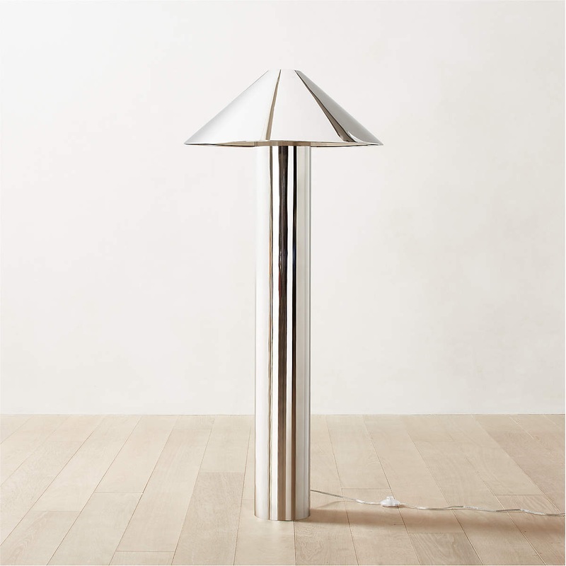 A stunning modern floor lamp thoughtfully designed by VUUE. Solid stainless steel is cut to length and pressed before it's welded into a sleek, cylindrical silhouette. The polished base supports a tapered shade to complete the single-material design. Part