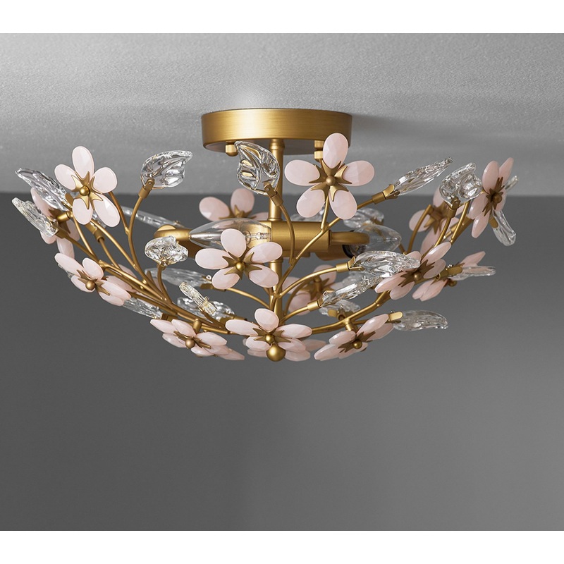 Glass petals, leaves and beads are mixed with lustrous antique gold for a flushmount that adds instant charm to their room.DETAILS THAT MATTERExpertly crafted with glass, beads and iron.Flowers are handcrafted and finished in pink with clear glass leaves.F