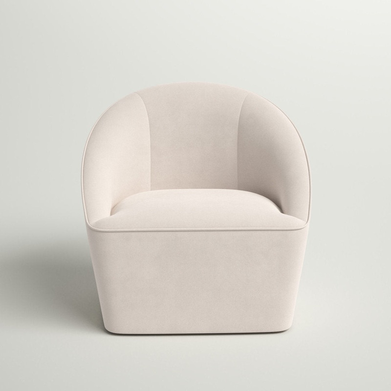 Spruce up your living room, bedroom, or reading nook with this modern barrel chair. It's made with a kiln-dried wood frame that sits on a stainless steel pedestal base that lets you swivel 360. Its rounded back curves around the sides to act as arms, great
