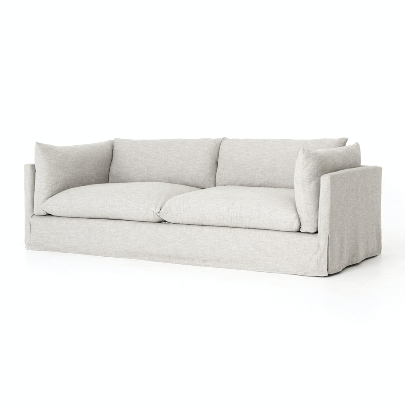 Loungey, slipcovered sofa is made for modern living. Shelter arms and pillow-inspired cushions are covered in extraordinarily comfortable, durable, and stain-resistant Crypton fabric.Colors:Valley Nimbus, Dark WalnutMaterials:53% Poly/35% Ray/12% Flax, Ban