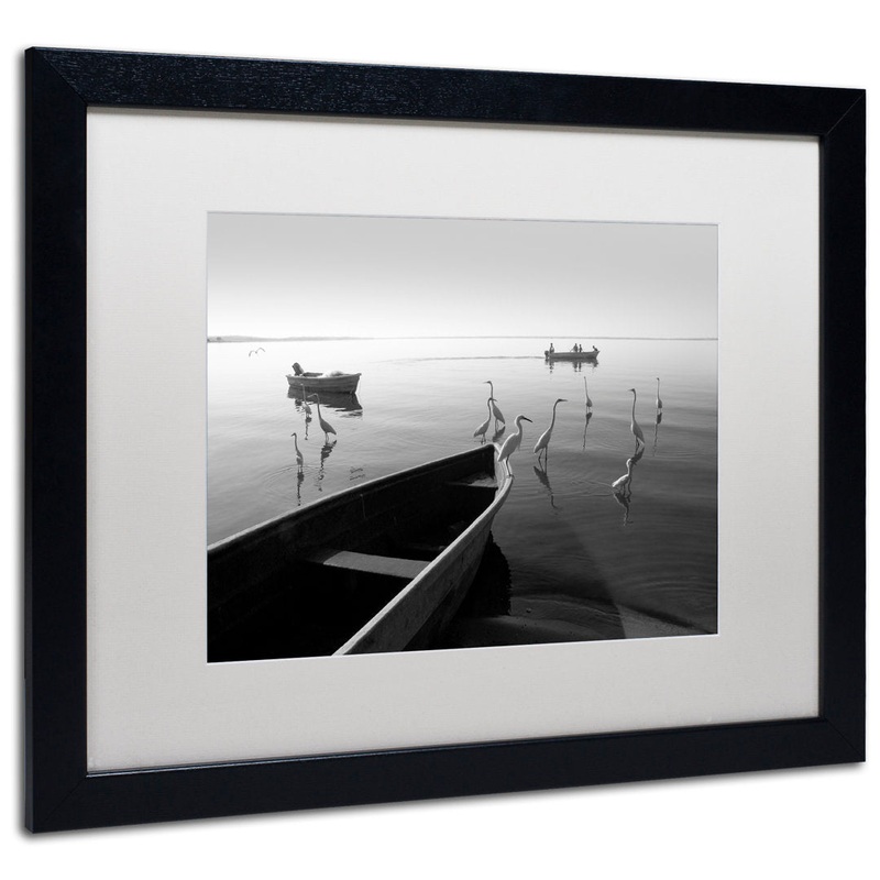 Herons and 3 Boats by Moises Levy Framed Photographic Print on Canvas in Black/White Trademark Fine Art Mat Color: White Size: 16″ H x 20″ W x 0.5″ D