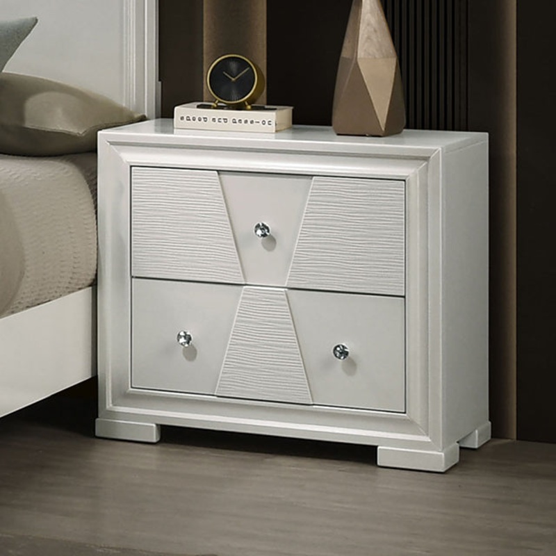 Contemporary White Solid Rubberwood Textured Trapezoid Front Panels Round Acrylic Knobs English Front & Back Dovetail Drawers Center Metal Glide