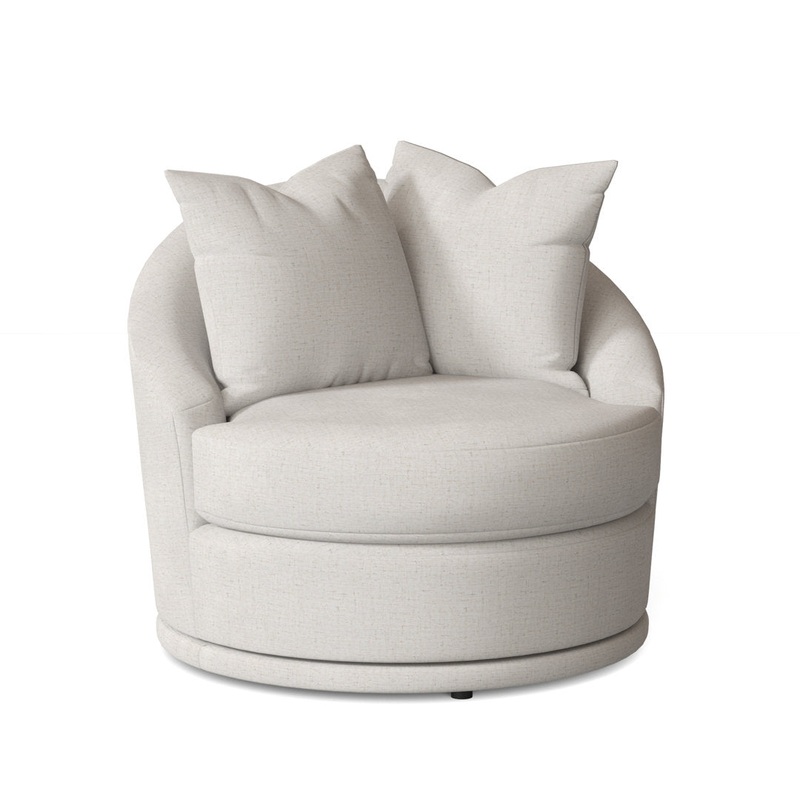 This barrel chair features a 360 swivel base and plenty of cushion for your living room or den. Made in the USA, it has a kiln-dried hardwood frame that's wrapped in your choice of upholstery. Plus, it includes a mix of polyester and foam filling, with sin