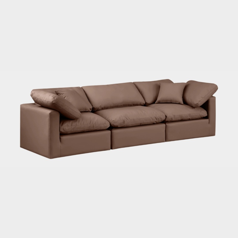 Experience ultimate comfort and style with our brown vegan leather Indulge Sofa. The luxurious vegan leather will elevate the aesthetic of any room. This sofa provides ample space for you to relax while its modular build offers the option of unlimited conf