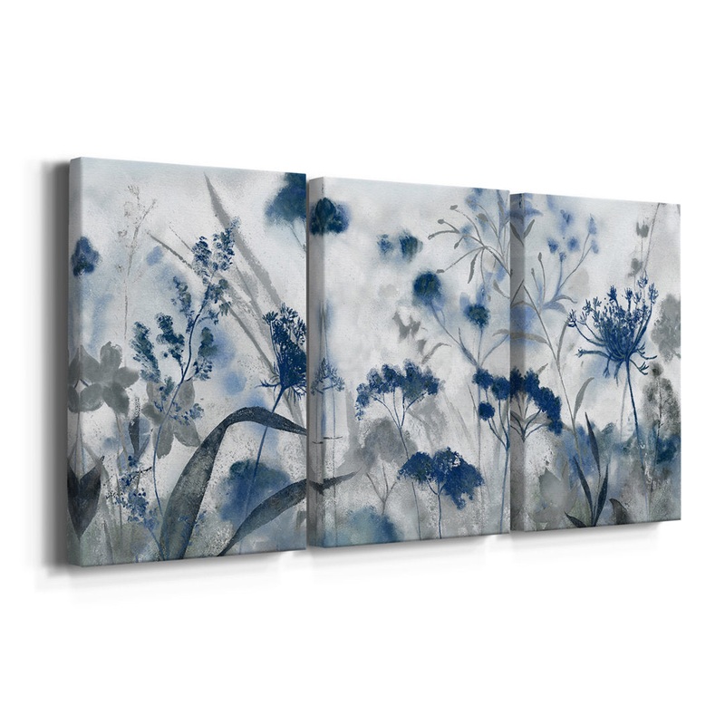 This 3-piece set of painting prints features a dynamic subject of indigo plants with contrasting hues and a sleek, gallery-wrapped look. Each one highlights vibrant blooms and leaves hovering over a foggy, muted background. Tones range from vivid dark blue