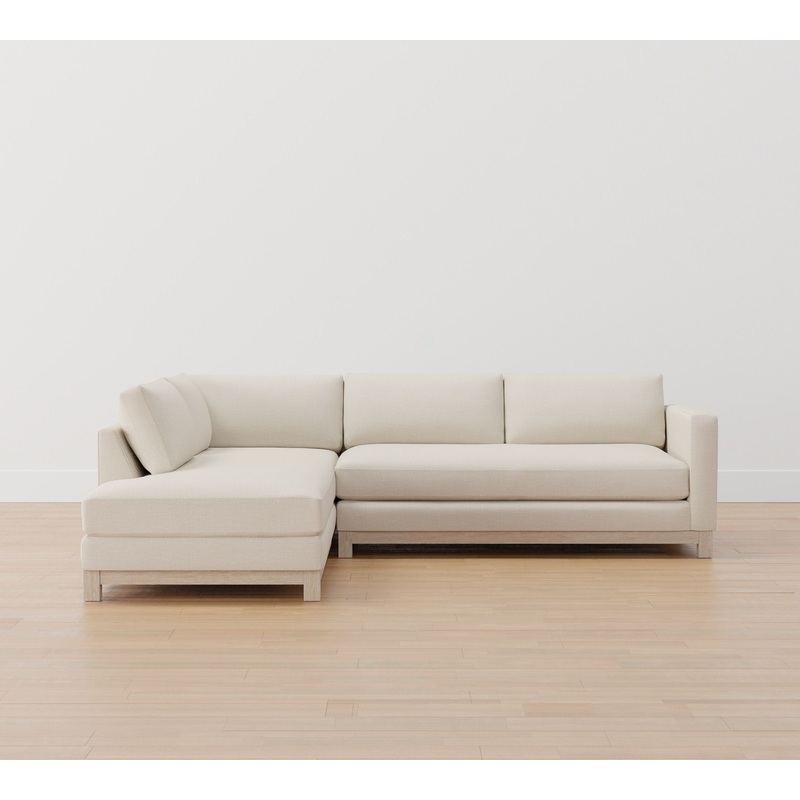 Square arm.Solid ash wood base is finished in Seadrift.Loose cushions.Polyester-wrapped cushions for a firmer feel.No-sag steel sinuous springs provide cushion support.Mortise-and-tenon joinery provides exceptional structural integrity.Hidden steel connectors hold modular pieces securely together.Crafted in America by our own skilled artisans from USA and Imported materials.110″ Width Sectional includes: 1 Left- or Right-Arm Loveseat and 1 Left- or 1 Right-Return Bumper.CAREVacuum cushions regularly.To prevent fading, keep fabric out of direct sunlight.Blot spills immediately with a clean, colorfast towel or sponge.ASSEMBLYWhite Glove Service: Items are delivered to your room of choice by appointment, then unpacked and fully assembled by a skilled two-person team. Includes packaging removal and recycling. Fee varies by location and order total.To ensure this piece is the right fit, see our How To Measure Guide. If you need help, our Design Crew is happy to answer any questions virtually or in your home. Book an appointment.