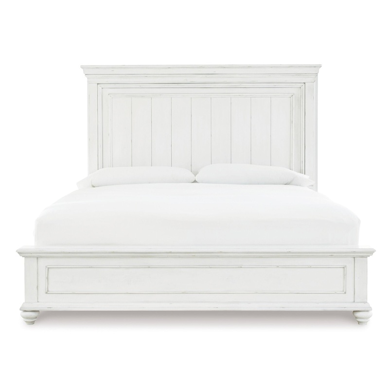Give your retreat vintage charm with this queen panel bed. In a beautifully distressed white-washed finish, you'll love the headboard's grand style featuring a picture framed panel. Generously scaled moulding from top to bottom, along with bun feet give th