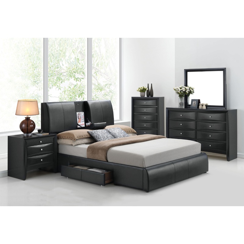 ACME Kofi Eastern King Bed w/Storage, Black PU (1Set/4Ctn), 95" x 80" x 46"H, One Side Storage Drawer, 152lbs. This Kofi contemporary upholstered bed will make a stunning focal point in your master bedroom. The storage headboard with low profile footboard