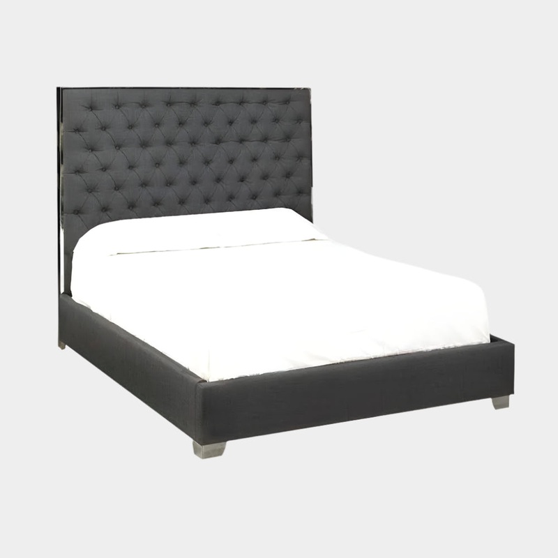 The polished stainless steel frame and accents provide a chic accent.The bed has a grey inset tufted upholstery panel.Prepare to relax in a glamorous style.This bed will deliver sophistication, elegance, and comfort every single night.Available in King and