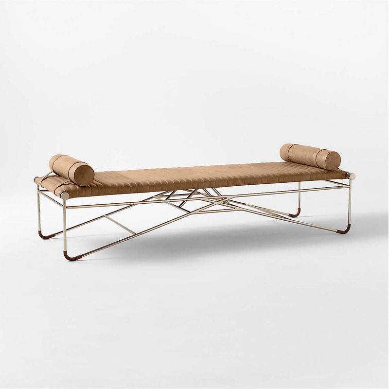 Designed by goop, La Strizza basically translates to “the shrink bench.” Rich leather upholstery contrasts with simple, minimal bench frame for a modern look with hints of vintage and deco. Round bolster pillows on either end are removable for a versatile look. CB2 exclusive.La Strizza 75″ Saddle Leather Bench with Bolster Pillows by Goop 75″Wx28″Dx16″HDesigned by goopEach piece will vary due to the natural characteristics of the untanned leatherRemovable bolster pillows attach to the frame using a snap closureStainless steel base with hand-polished champagne finishWipe with a soft, damp cloth; no abrasive cleanersKeep out of direct sunlightMade in IndiaSee product label or call customer service for additional details on product content