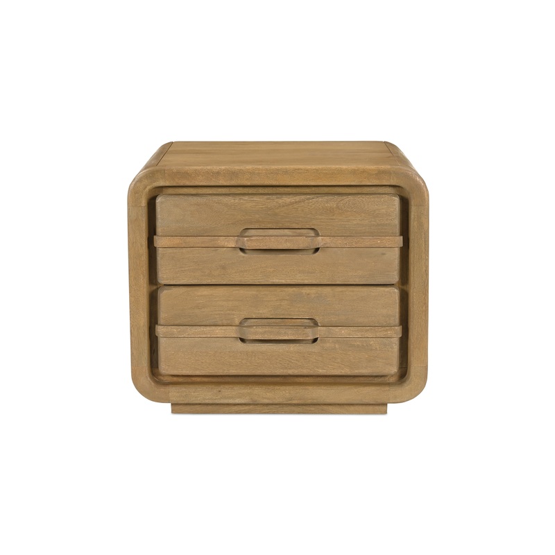 The Lennon nightstand is a sleek nod to Mid-Century storage. Its rounded corners and inset handle underscore a look that is clean and captivating, while its two spacious drawers provide ample storage. Crafted from timeless mango wood and finished in vintage brown, this nightstand seamlessly blends rustic allure with contemporary design.